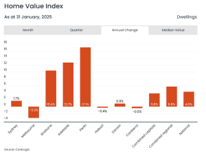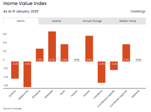 In January, national dwelling values saw only a minor change, dipping slightly by 0.03%. This stabilisation comes after a year of strong growth in 2024. However, while the overall market remained balanced, the picture was quite different when comparingcapital cities to regional areas.