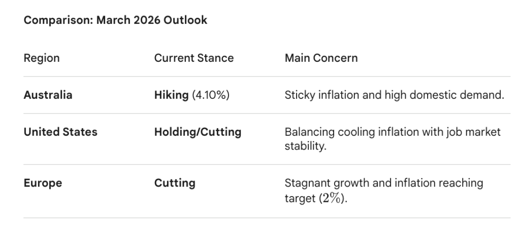 It can definitely feel like Australia is the odd one out. But the key difference is inflation. While the US and Europe appear closer to the end of their inflation fight, Australia is still dealing with inflation that remains stubbornly high and outside the RBA’s comfort zone. Add in a tight labour market, stronger than expected private demand, and the risk that rising fuel and transport costs feed further into everyday prices, and you can see why the RBA still has an upward bias even if it is clearly a close call.