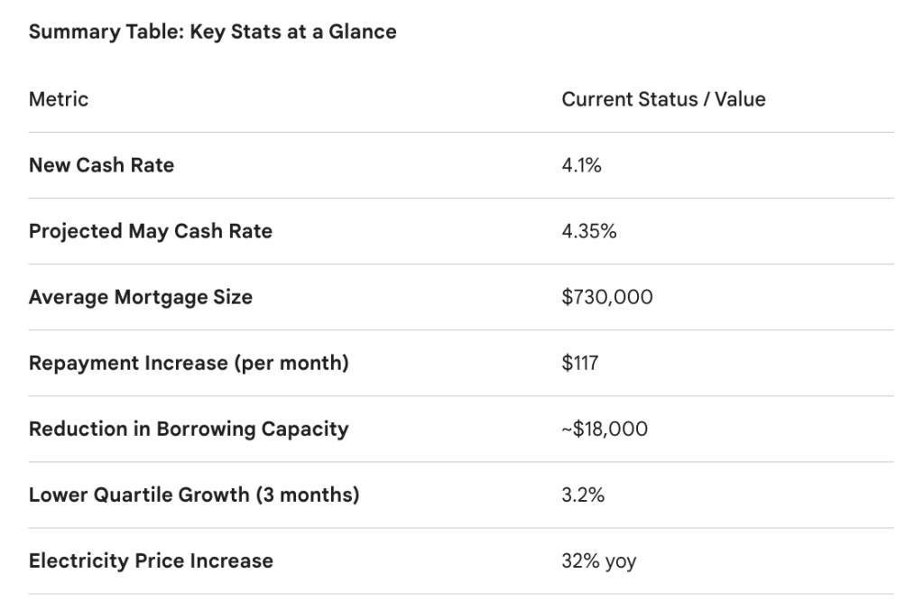 Recent commentary around the latest rate move also highlighted what that means on the ground. On an average new mortgage of around $730,000, the latest increase adds another $117 per month in repayments, while borrowing capacity for a median-income household is estimated to have reduced by around $18,000. At the same time, lower quartile property values have continued to outperform, which tells us buyers are still active, but increasingly driven by affordability.