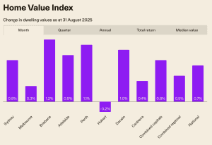According to PropTrack, Australian home values rose by 0.5% in August, marking the eighth consecutive month of growth and pushing prices to a fresh record high. Annual growth now sits at +5.3%. Cotality’s Home Value Index tells a very similar story, though with a slightly stronger read, values lifted 0.7% nationally in August, the fastest pace since May 2024, taking annual growth to +4.1%. The consistency across both data sets underlines that this isn’t just a seasonal bump; it’s a sustained upswing.
