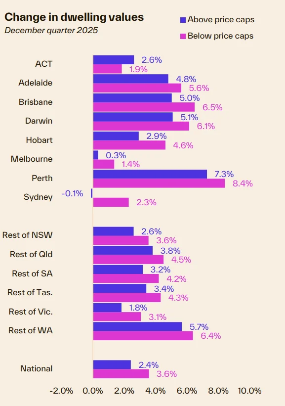 New data from Cotality shows that homes priced under the government’s expanded Home Guarantee Scheme caps rose 50% faster than higher-priced homes in the December quarter (3.6% vs 2.4% nationally). This is no accident. High interest rates and serviceability hurdles haven’t killed buyer demand-they’ve just redirected it. Buyers and investors alike are concentrating their activity into more affordable homes.