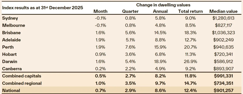 Cotality’s Home Value Index ended 2025 up 8.6% nationally, lifting the median dwelling value to $901,257. December’s 0.7% rise marked the smallest monthly gain in five months, though that’s a seasonal pattern rather than a signal of slowing.
