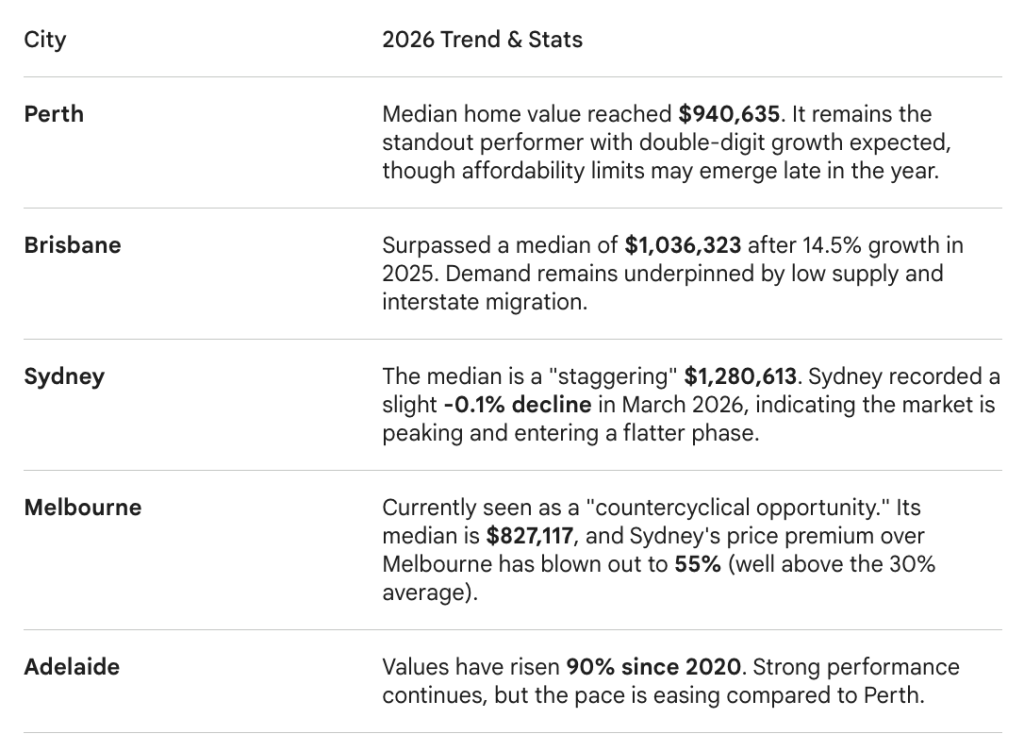 At the same time, the market is clearly splitting. Sydney and Melbourne are showing signs of slowing, with Melbourne down 0.2% in March, while Brisbane and Perth continue to perform strongly. Brisbane is up 19.0% annually and Perth is leading the country at 24.3% annual growth.
