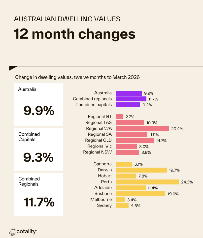 According to Cotality’s April Housing Chart Pack, Australia’s residential market is now worth $12.6 trillion. National dwelling values rose 2.1% over the March quarter and 9.9% over the year to March, which is the fastest annual pace since mid-2022.